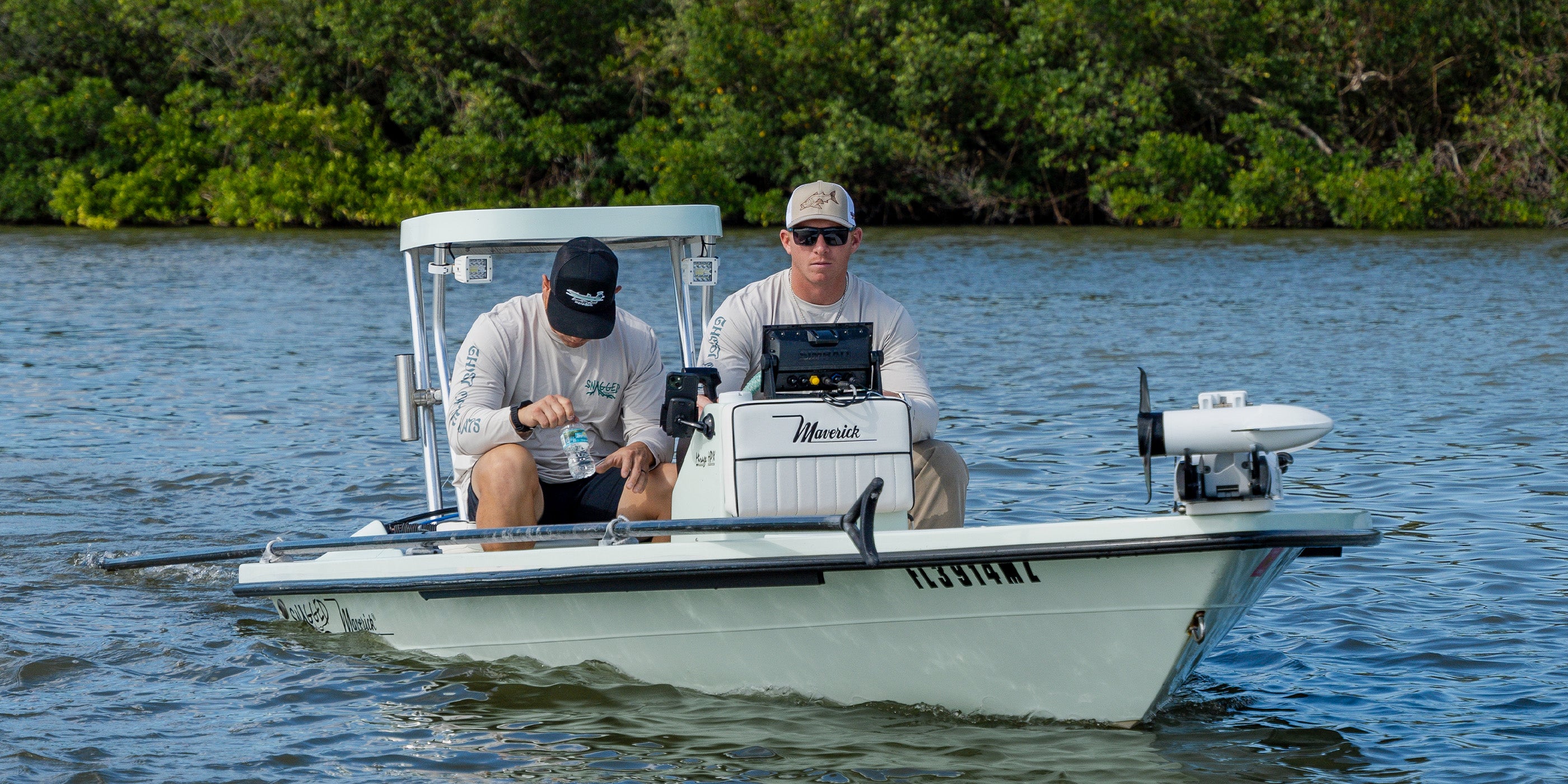 - Design: Embroidered snook artwork on a tan front panel.